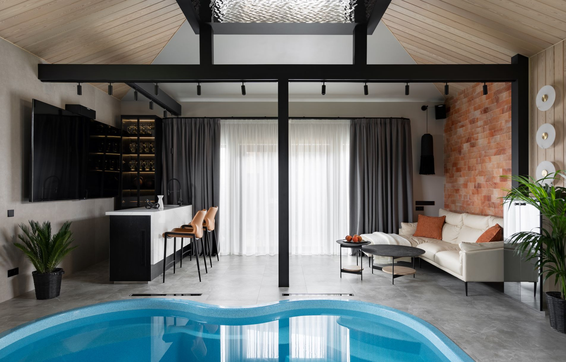 Дизайнер Ксения Гузий обустроила частный спа-комплекс для семейной пары, которая любит шумные вечеринки и теплые встречи с друзьями. Несмотря на скромную площадь в 60 кв. м, здесь нашлось место для всего, что нужно для отдыха и оздоровления. Дизайн выдержан в спокойной, минималистичной эстетике. За основу взята черно-белая палитра, разбавленная теплыми терракотовыми акцентами. Такой подход создает спокойный, не перегруженный фон, на котором яркие элементы смотрятся особенно выразительно.