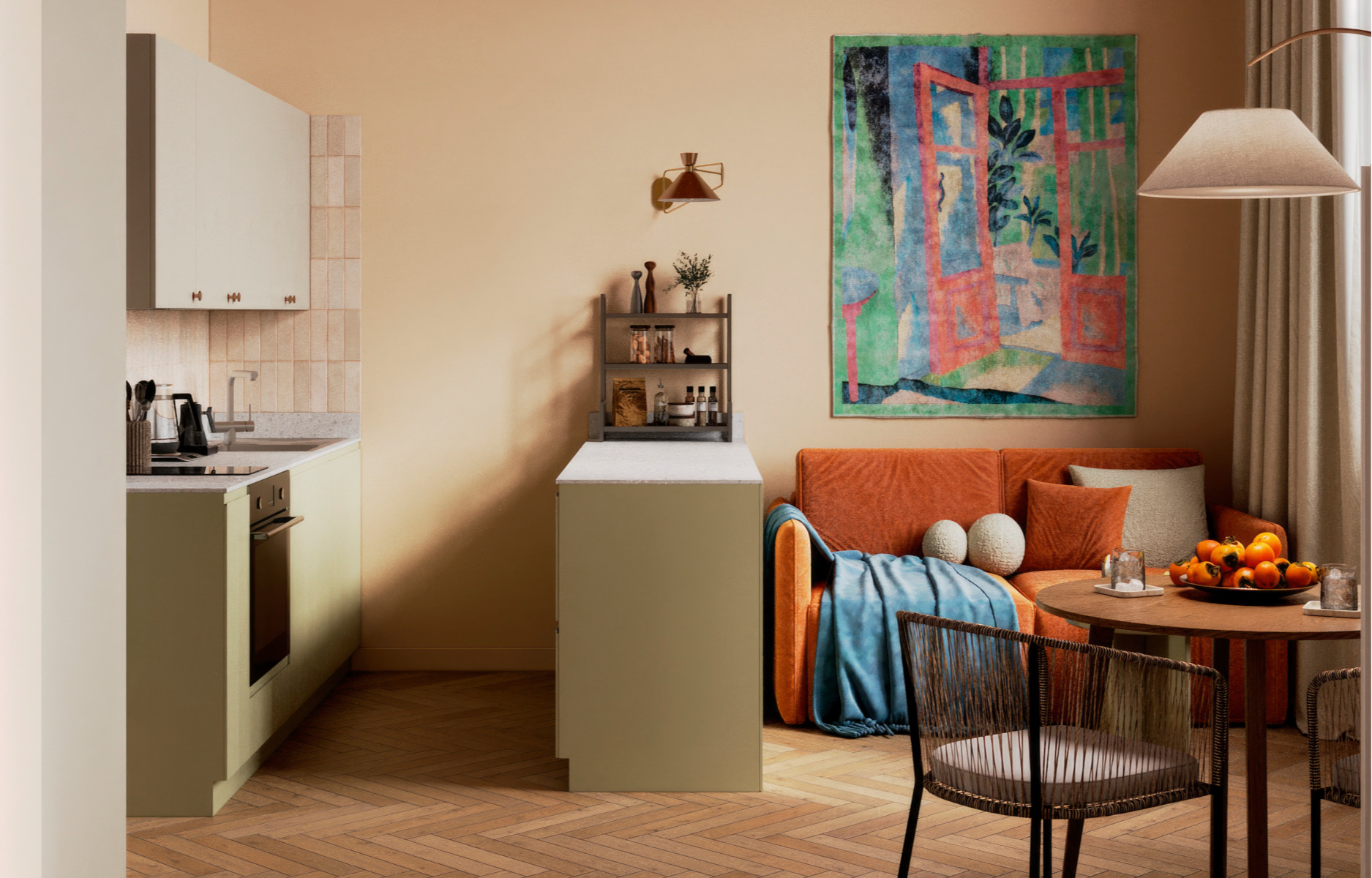 В интерьере преобладают теплые бежевые, персиковые, терракотовые оттенки, плюс зеленые акценты. Много разных фактур, которые визуально делают обстановку более сложной и интересной: столешница из искусственного камня, обеденный стол из шпона, глянцевый журнальный столик, микровелюр в обивке, плетеные спинки кресел, тканевый абажур светильника. Над небольшим диваном в зоне гостиной разместили гобелен братьев Либа — он придает уют и объединяет цветовую палитру помещений.