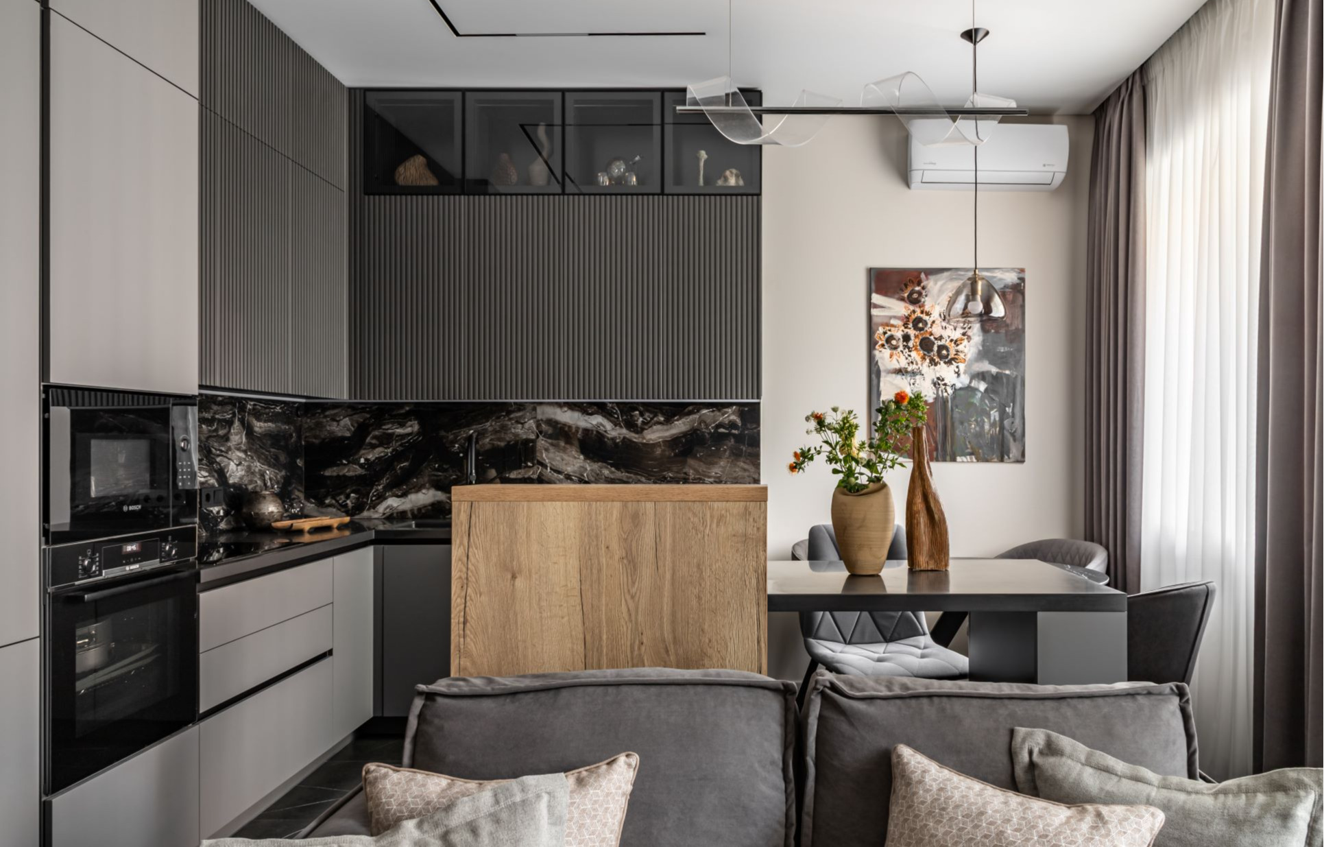 Отдельное внимание уделено коллекции элитного алкоголя, которую собирает муж. Сам алкоголь семья не употребляет, поэтому для его хранения были предусмотрены два винных шкафа: один интегрирован в кухонный остров, второй размещен в зоне гостиной.