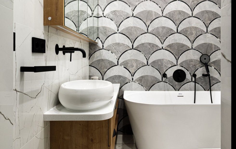 Логика «маленькое помещение требует мелкой плитки» не работает. Наоборот: много мелкой плитки создает много швов, а швы дробят поверхность визуально. Крупная плитка (60x60 или 60x120 см) в маленькой ванной дает чистые непрерывные плоскости и ощущение большего пространства.