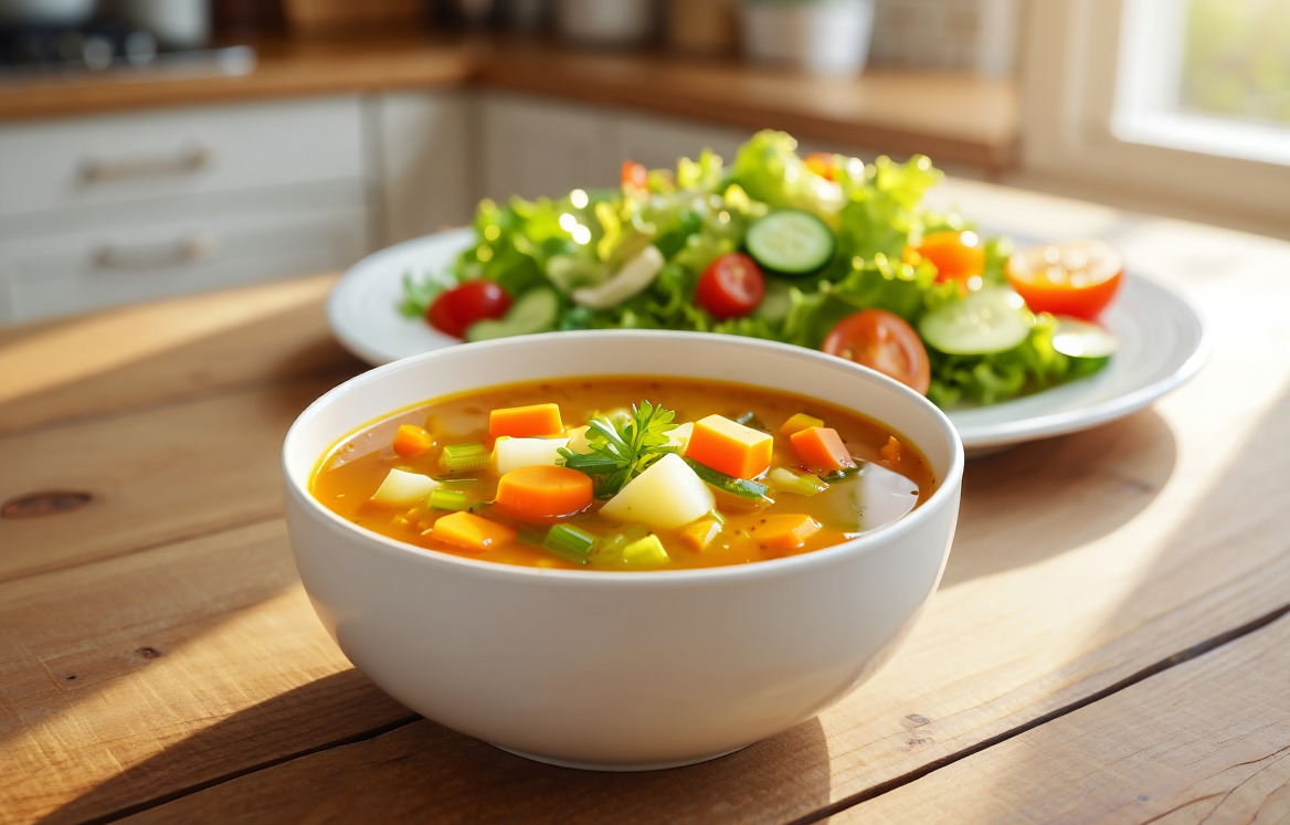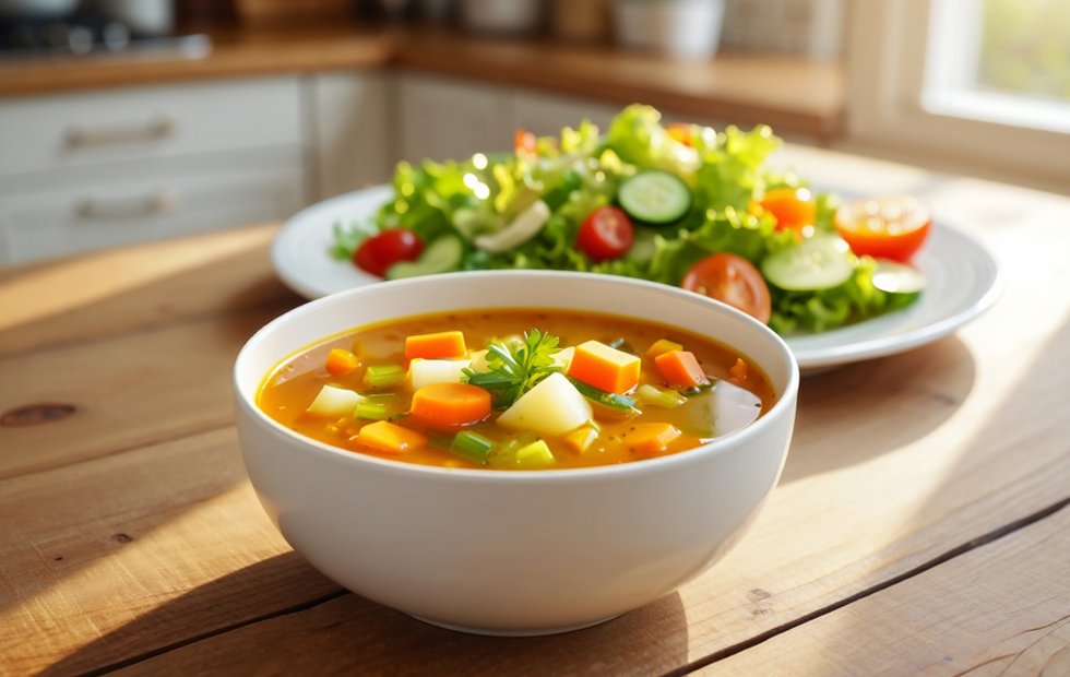 Суп как стартер перед основным блюдом снижает общий объем еды за обед. Это работает. Салат из сырых овощей с легкой заправкой (лимон, немного масла) дает клетчатку и разнообразие. Это тоже работает.