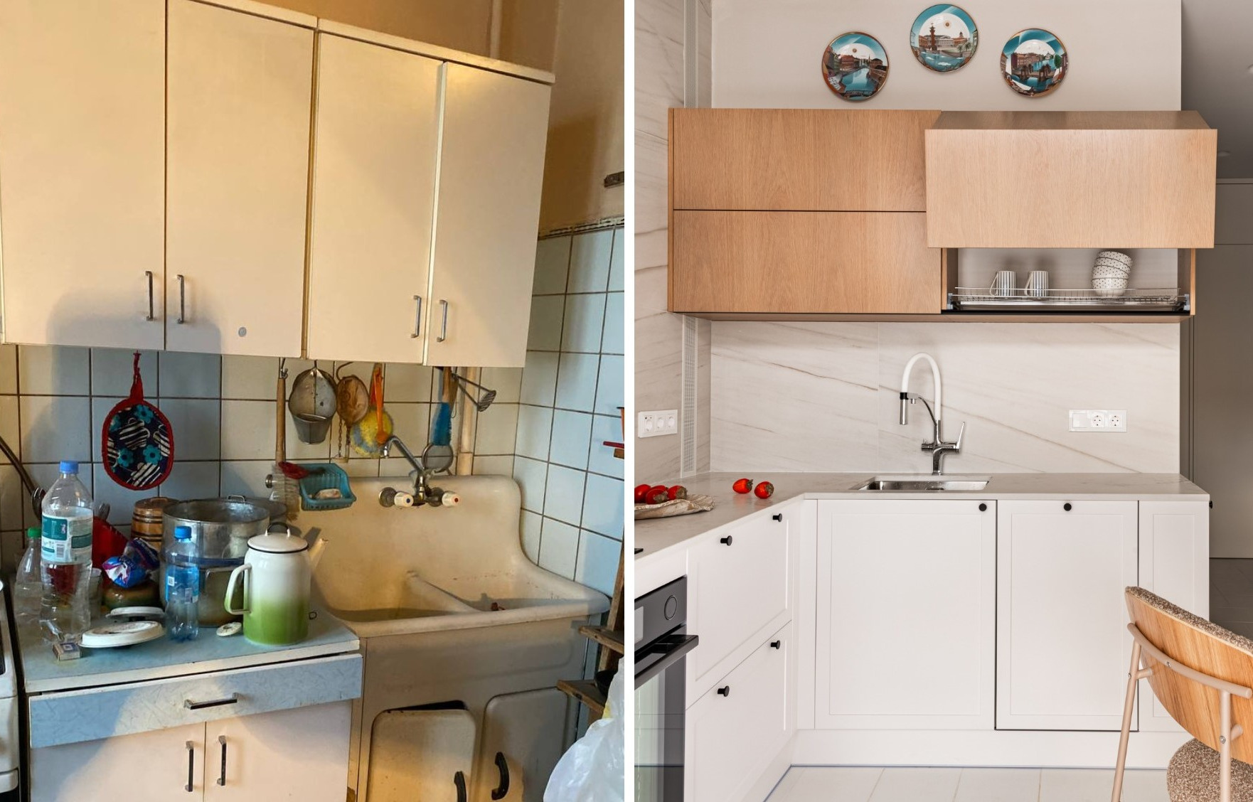Первоначально в квартире был газ, однако клиенты решили установить электрическую плиту. Газовую трубу оставили, обеспечив к ней доступ через перфорированную решетку слева от мойки. Организация кухонного пространства была продумана до мелочей: создана большая рабочая поверхность, предусмотрен буфет для красивой посуды с нишей под микроволновую печь, а над мойкой разместили шкаф для хранения. Пространство над ним украшают тарелки Императорского фарфора из Санкт-Петербурга, внося исторический акцент.