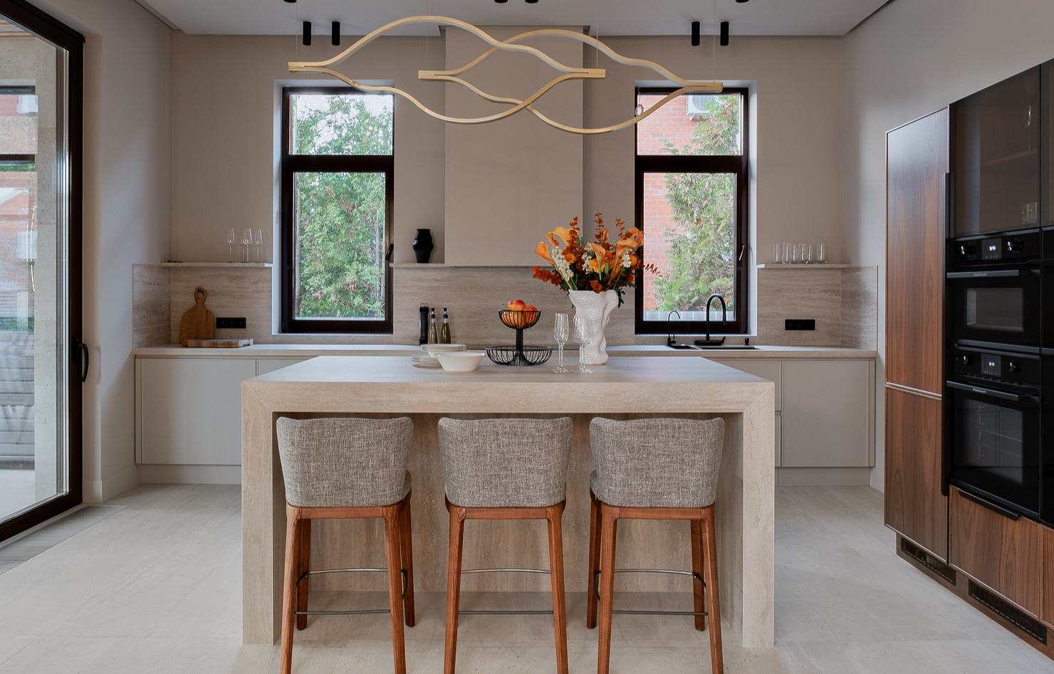 На кухне установлены раздвижные двери: с одной стороны они ведут в гостиную, с другой — на веранду. Эта функциональная деталь позволяет гибко объединять или разделять пространства, адаптируясь к текущим потребностям. Например, во время приготовления пищи или когда кто-то отдыхает в гостиной, закрытые двери предотвращают распространение запахов и звуков. Раздвижные двери, ведущие с веранды, позволяют легко трансформировать ее в открытую террасу, идеальную для обедов на свежем воздухе или приема гостей с барбекю.