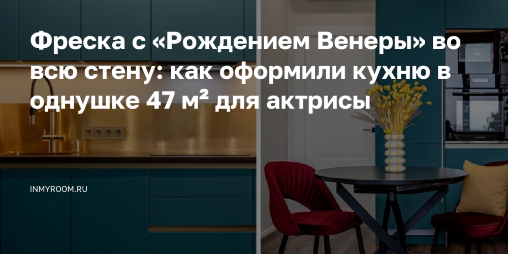 Палитра кухни-гостиной — бирюзовый, бордовый, желтый и латунь — гармонично выглядит вместе именно потому, что каждый цвет повторяется минимум дважды. На стене гостиной находится фреска с «Рождением Венеры» Боттичелли в графичном черно-белом исполнении, тоже от пола до потолка. Это не принт на обоях, а полноценная роспись, которая занимает всю плоскость.