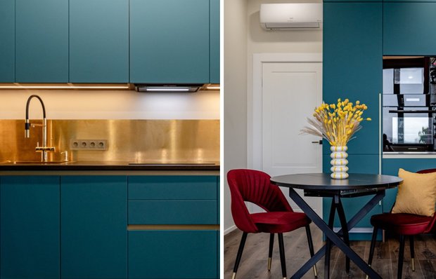 Гарнитур угловой, насыщенного бирюзового оттенка от пола до потолка и без верхних открытых полок. Фасады матовые без ручек: латунные врезные профили по нижнему краю заменяют привычную фурнитуру и сразу задают теплый металлический акцент. Фартук выполнен из сплошного листа латуни.