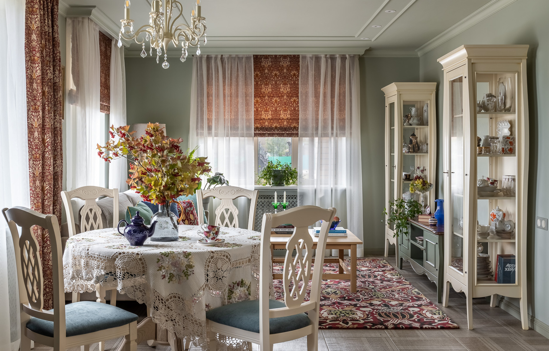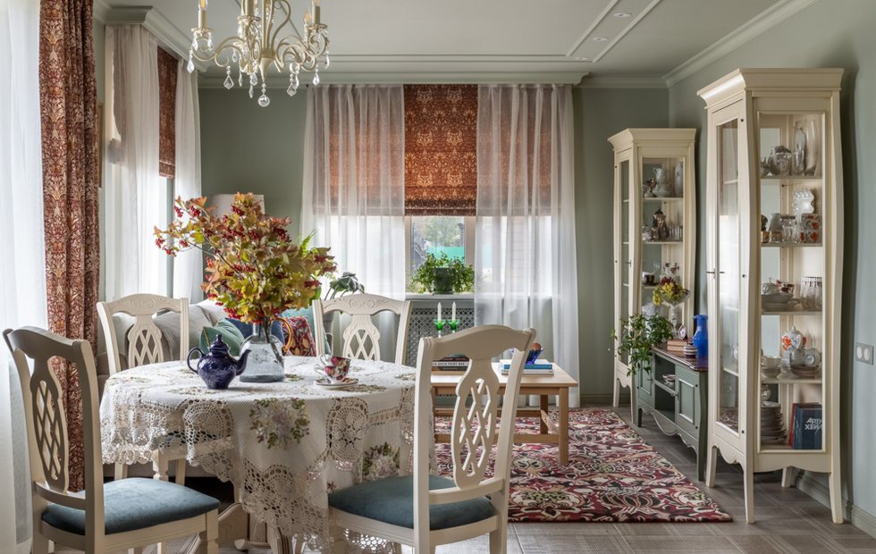 На кухне установлен гарнитур, изготовленный на заказ в темно-зеленом цвете. Особую изюминку ему придают вишневая варочная поверхность и вытяжка. Из кухни имеется выход на веранду, где расположились обеденный столик со стульями, а также столетняя резная скамья. Не обошлось здесь и без аутентичной печи.