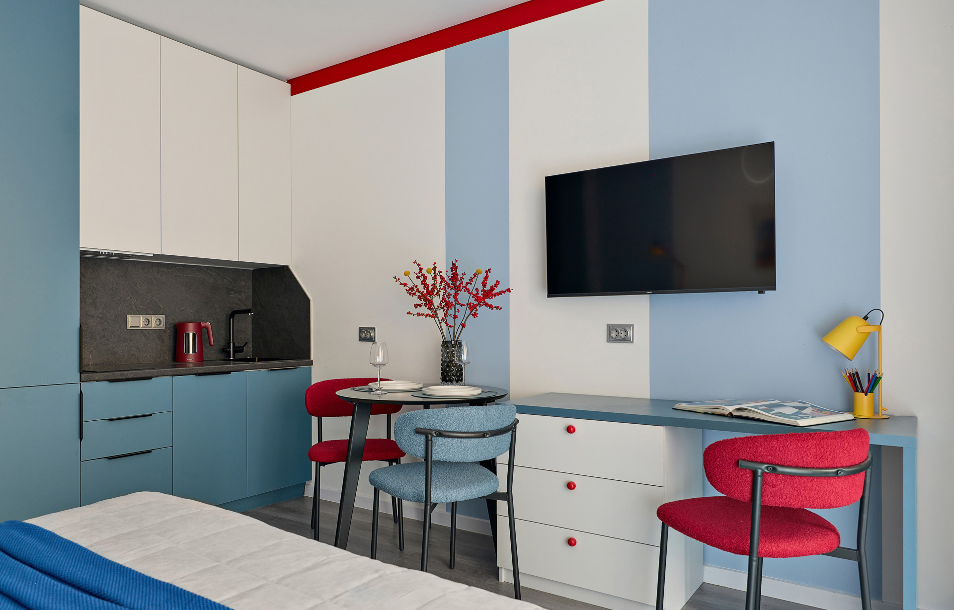 Кухню спроектировали в двух цветах — светло-серый верх, темно-синий низ, с графитовой столешницей. Разместили обеденную группу с округлыми стульями в красном и синем букле и зону гостиной с креслом-кроватью. Это позволило комфортно размещать до трех гостей, что критически важно для посуточной аренды.