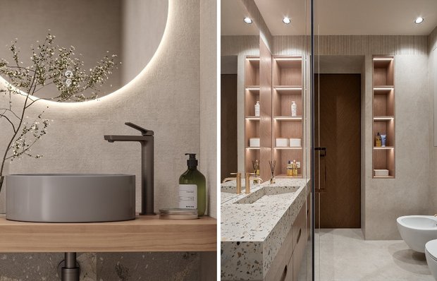 Дерево, камень, терраццо в отделке ванной комнаты добавляют тактильности и ощущения дорогих материалов. Даже керамогранит под дерево или мрамор создает визуальный эффект премиальности: здесь важна качественная имитация с реалистичной текстурой.