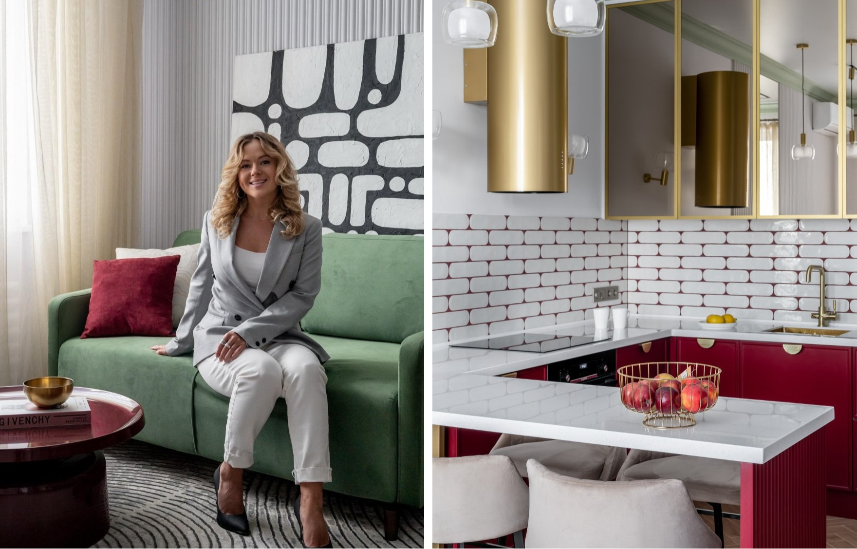 Посмотрите, каким стильным и яркимо получился интерьер! Эффект создает смелое сочетание цветов: белую основу разбавили сочные винные акценты в мебели, напольных плинтусах и обрамлении дверей. Оливковый на стенах и потолочных карнизах добавляет интерьеру благородной глубины.