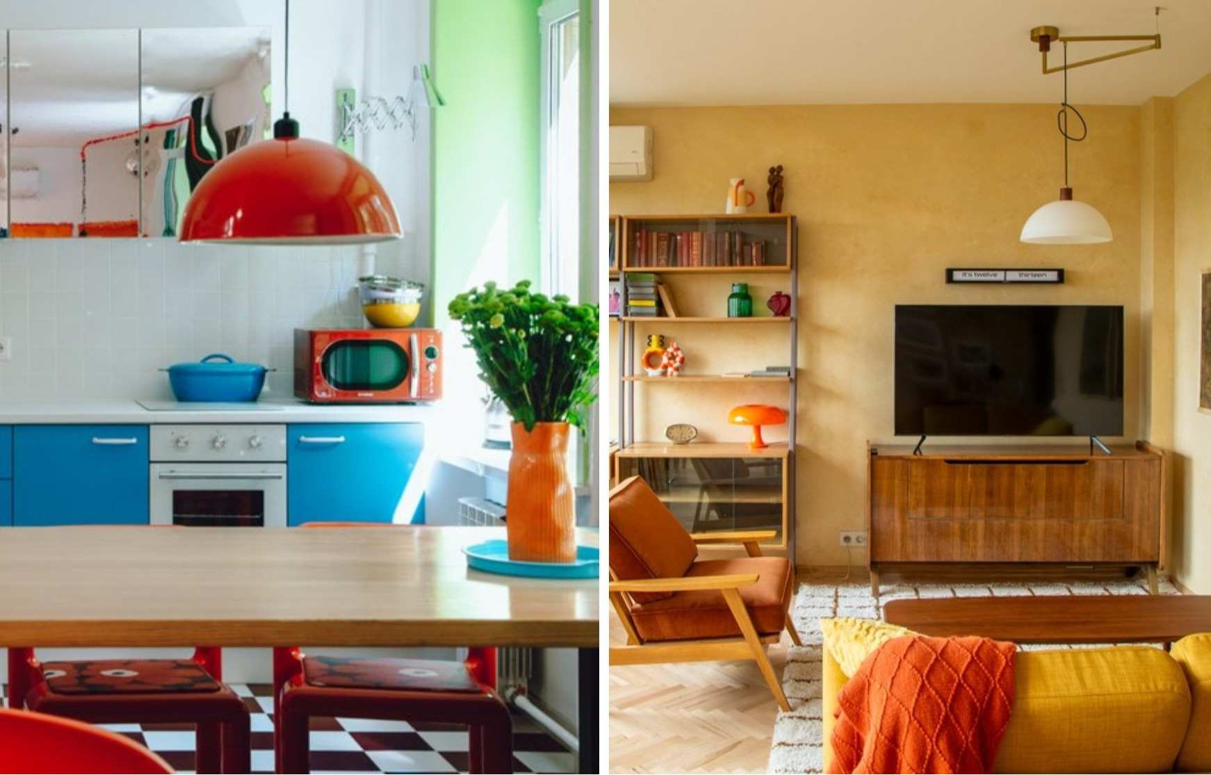 Эта квартира в доме 1960-х годов после переделки стала источником ежедневной радости — Павел сделал ставку на бодрящий «дофаминовый» стиль. Он заменил нейтральную палитру на насыщенные оттенки, дополнив их необычными формами и жизнерадостным декором. В гостиной бережно отреставрированный исторический паркет стал идеальным фоном для современных акцентов: стеллажа с цветными кромками в духе mid-century, коллажа из постеров и ультраяркого календаря.