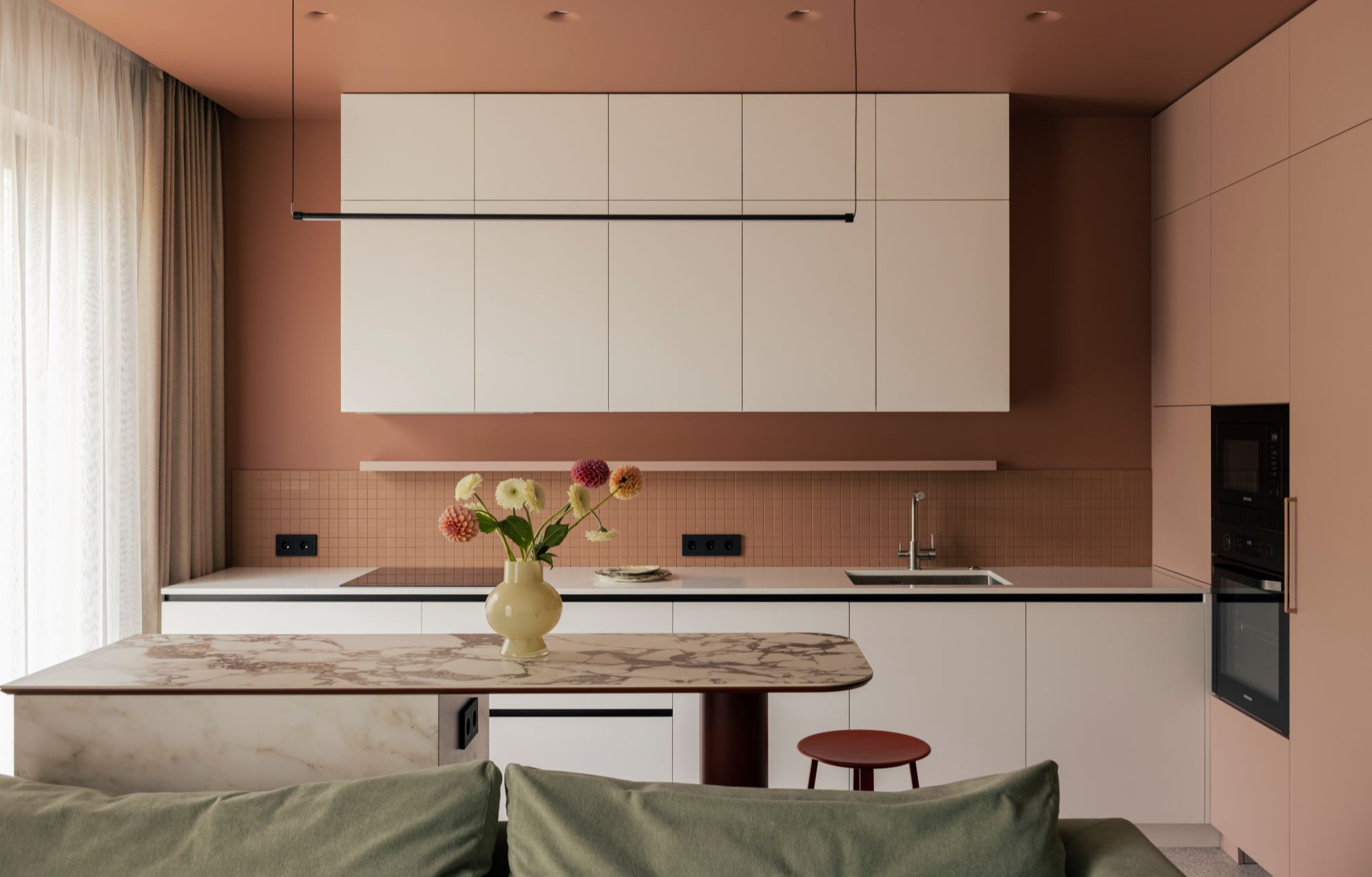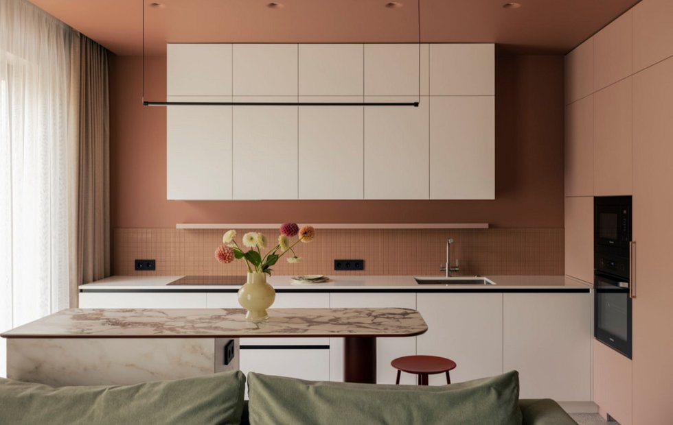 Из прихожей взгляд сразу устремляется к уютному дивану и панорамному виду на террасу. Кухонные фасады выполнены в чистом белом цвете, в то время как стены окрашены крупными блоками в сложную гамму пыльно-розовых и пудровых оттенков. Этот теплый фон подчеркнут изящной плиткой фартука и открытой полочкой в тон.