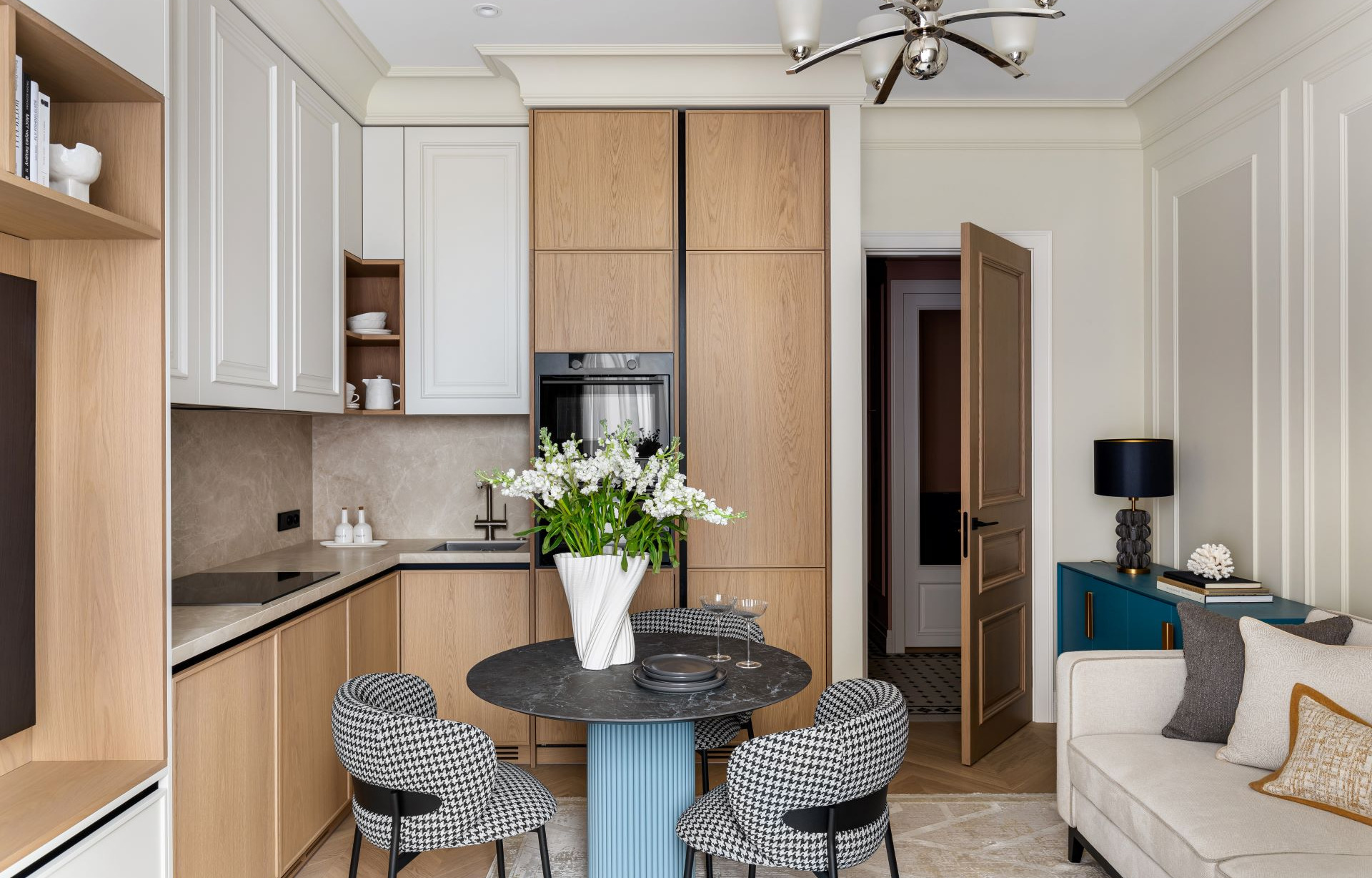 Вся корпусная мебель была изготовлена на заказ. Кухонный гарнитур органично интегрирован с ТВ-зоной, создавая единый элегантный фронтон. Встроенная техника скрыта в шкафах-колоннах, а в верхней угловой секции предусмотрены открытые полки для столовой посуды.