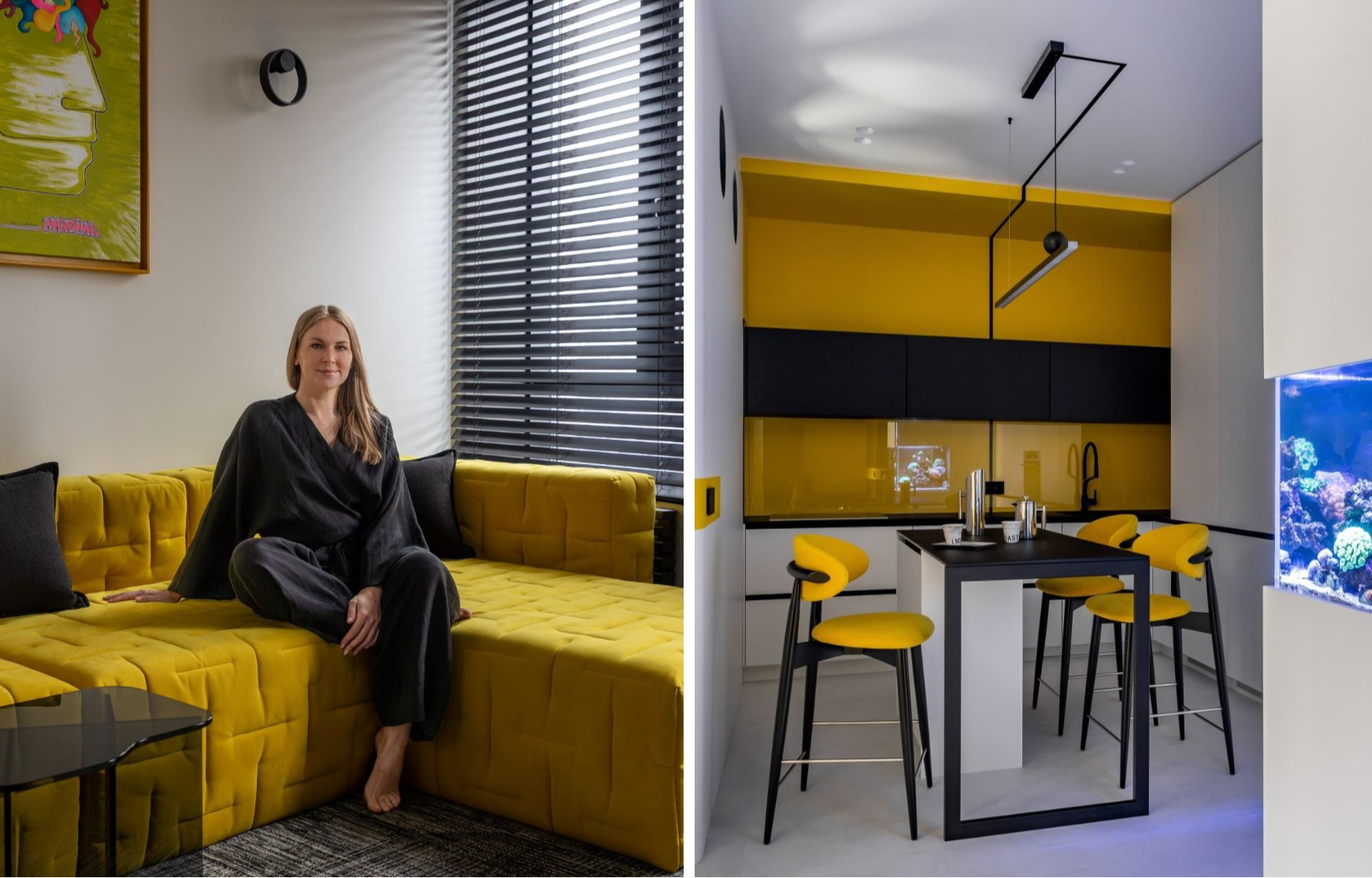 Пространство получило динамичное и яркое цветовое решение. Квартира начинается с полностью черной прихожей с яркими желтыми линиями, которые зрительно ведут в светлую кухню-гостиную с желтым кухонным блоком и желтым диваном. Акцент спальни — насыщенный ультрамариновый синий, а детскую украшают яркие голубые детали.