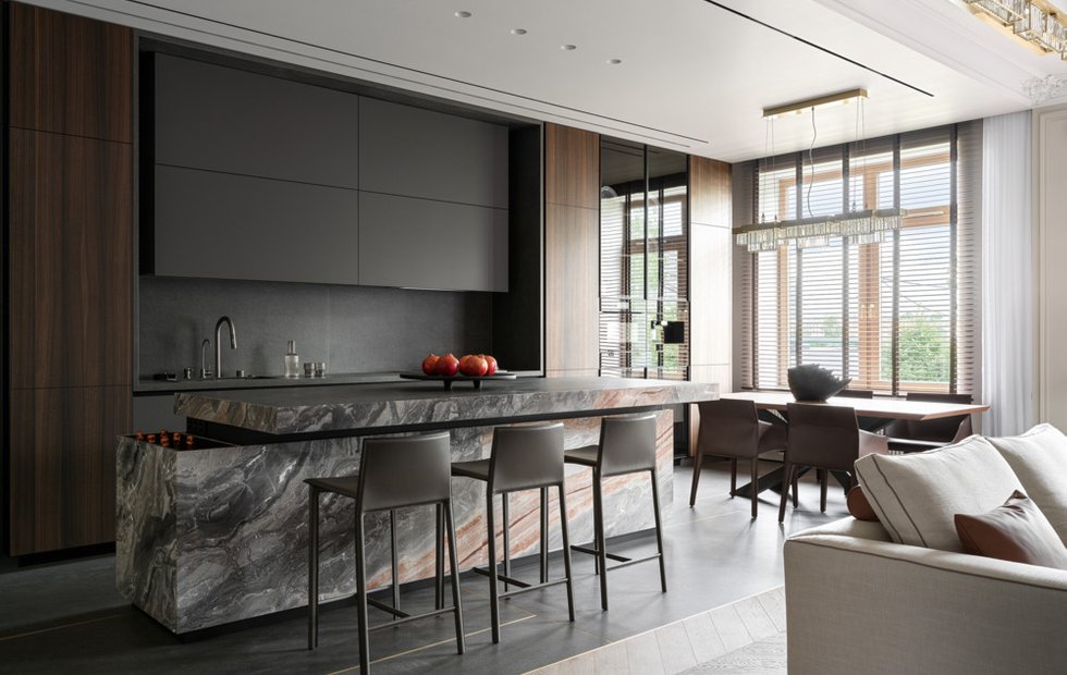 Цветовая палитра основана на натуральных, спокойных сложных оттенках: мореный эвкалипт, рыжая кожа, мрамор и темный гранит. Сердцем проекта стал мрамор Арабескато Орабико — многослойный материал с красными прожилками, сочетающийся с шпоном мореного эвкалипта и ореха. Кухонный остров представляет сложное соединение мрамора и керамогранита. Стены покрыты декоративной штукатуркой с легким эффектом для создания глубины.