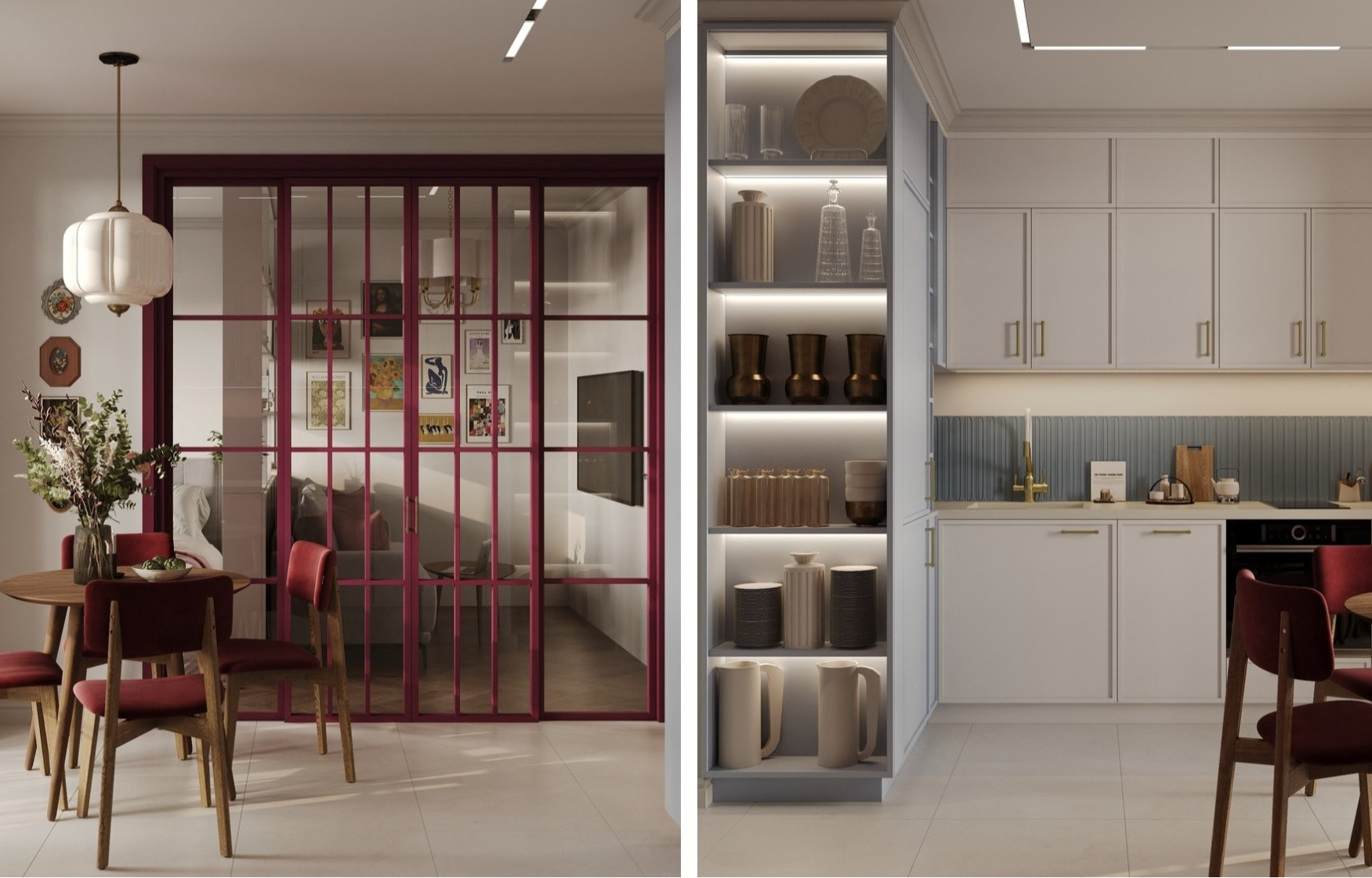 В основу проекта легли три цвета: нежный розовый, бордо и небесно-голубой. Они хорошо сочетаются между собой: розовый с голубым создают легкую, воздушную гамму, а бордо добавляет характера и расставляет акценты.