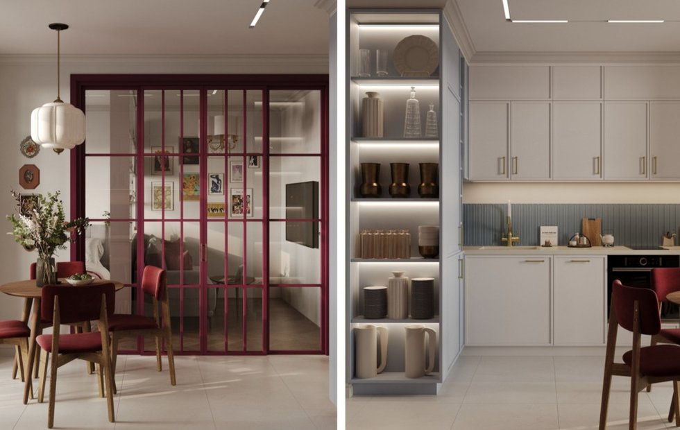 Для отделки стен использовали краску; на полу в жилой зоне — паркет, в кухне, прихожей и санузле — керамогранит. Изюминка проекта — французская стеклянная дверь цвета бордо, которая отделяет кухню от приватной части квартиры.