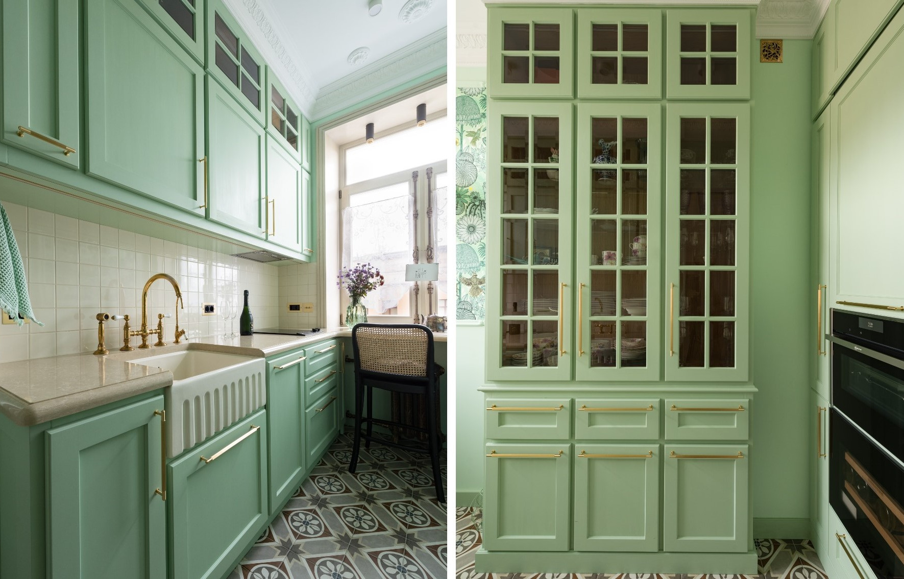Мебельная композиция изготовлена на заказ. Фасады выполнены из МДФ и окрашены вручную. Каркасы из древесного шпона, выдвижные системы и ящики — из массива дерева, соединенного традиционным способом «ласточкин хвост». Стены выкрашены в такой же оттенок, как и кухонная мебель. Пространство дополнено эксклюзивной фреской и светильниками в винтажном стиле.