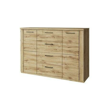 Ищете вместительную систему хранения, которая впишется в любой интерьер? Комод Doorset с двумя дверцами и четырьмя ящиками решает проблему организации пространства на 135 см ширины при глубине всего 41 см, занимая минимум места в комнате. Три главных преимущества: - Универсальность — подходит для гостиной, спальни и прихожей - Вместительность — комбинация из 4 ящиков и 2 отделений с полками - Практичность — матовая поверхность не собирает отпечатки пальцев Комод Doorset идеально впишется в помещение от 10 м². Его габариты (135×41×95 см) позволяют разместить комод даже в небольших комнатах, не загромождая пространство. Подходит для семей с детьми — матовая бежевая поверхность ЛДСП с текстурой дуба наварра скрывает следы прикосновений и легко очищается влажной тканью.Технические особенности: