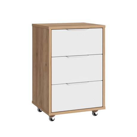 Нужно организовать рабочее пространство без потери мобильности? Тумба К-55 занимает всего 0,14 м², но вмещает три выдвижных ящика с полным доступом к содержимому. Сочетание натурального дерева и белых фасадов впишется как в домашний офис, так и в коммерческое пространство.Три главных преимущества: