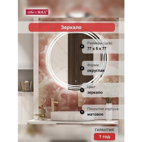 Нужно зеркало, которое не запотевает после душа? Модель Bologna от итальянского бренда Art&Max решает эту проблему встроенным антизапотевателем. Плюс круговая LED-подсветка мощностью 9,6 Вт — не придется устанавливать дополнительные светильники над раковиной. Три главных преимущества: - Антизапотеватель — зеркало остается чистым даже в ванной с плохой вентиляцией - Сенсорное управление — включается касанием, не нужны кнопки и выключатели - Готово к установке — крепления в комплекте, сборка не требуется Подходит для ванных комнат от 4 м². Размеры 77×77×5 см — оптимальный вариант для одной раковины шириной 60-80 см. Круглая форма смягчает углы в небольших санузлах. Материал корпуса — пластик с матовым покрытием. Легко чистится, не боится влаги. Вес 6,5 кг — повесите на гипсокартонную стену без усиления. LED-лампы встроены по контуру — светят мягко, без теней на лице. Потребляют 9,6 Вт — это в 5 раз экономичнее обычных галогенных ламп. Срок службы диодов — до 50 000 часов работы. Гарантия производителя — 1 год. В комплекте идут крепления для монтажа на любую стену.Отзывы