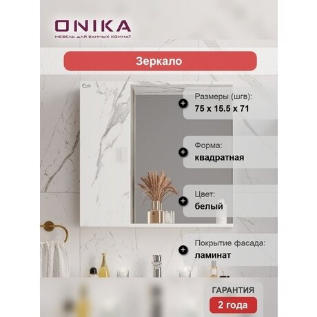 Нужно разместить косметику, щетки и средства для ухода в маленькой ванной? Зеркало-шкаф «Марбл» объединяет зеркальную поверность и систему хранения в корпусе шириной всего 75 см. Встроенный доводчик закрывает дверцу бесшумно — не нужно контролировать силу нажатия. Три главных преимущества: - Розетка в корпусе — подключайте фен или электробритву прямо у зеркала - Механизм доводчика — дверца закрывается плавно и бесшумно даже при резком толчке - Две зоны хранения — шкафчик слева для высоких флаконов, открытые полки снизу для полотенец Зеркало подходит для ванных комнат от 3 м². Габариты: 75 см в ширину, 71 см в высоту, 15,5 см в глубину — не выступает далеко от стены и экономит пространство. Создано для тех, кто ценит функциональность: семей с детьми, владельцев малогабаритных квартир, любителей минимализма. Корпус из ЛДСП — влагостойкий материал, который не разбухает от пара. Фасад из МДФ с ламинированным покрытием под мрамор — протирается обычной влажной салфеткой, на белой поверхности не видны капли воды. Матовое покрытие — не остается отпечатков пальцев. Квадратная форма — универсально вписывается в современный интерьер и минимализм. Белая фурнитура — сливается с корпусом и не выделяется контрастом. Петли расположены слева — учитывайте это при планировании размещения. Вес 12,3 кг — можно повесить на гипсокартонную стену с усилением. В комплекте идут подвесы для монтажа. Гарантия 2 года — производитель Onika отвечает за качество механизмов и материалов.Отзывы