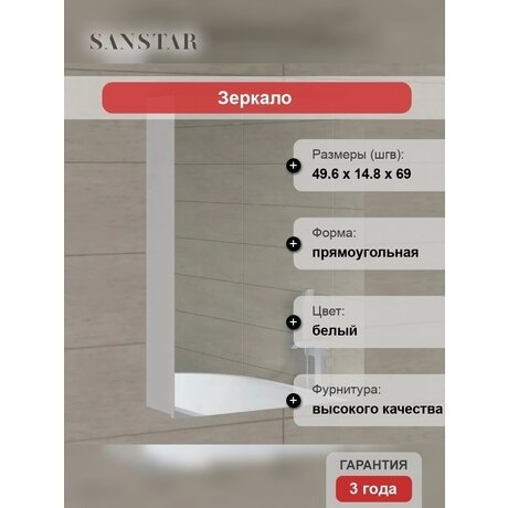 Нужно место для косметики и лекарств в маленькой ванной? Зеркало-шкаф Sanstar совмещает два предмета в одном — экономит 0,2 м² площади и убирает с раковины все флаконы. Три главных преимущества: - Доводчик в комплекте — дверца закрывается плавно и бесшумно, не хлопает даже при резком толчке - Универсальные петли — можно повесить с открыванием влево или вправо, меняются за 5 минут - Готов к установке — подвесы в комплекте, сборка не требуется Подходит для ванных комнат от 3 м². Ширина 49,6 см — поместится над стандартной раковиной 50 см. Глубина шкафа 14,8 см — внутри 2-3 полки для баночек и тюбиков. Высота 69 см — зеркало закрывает зону от плеч до макушки. Корпус из ЛДСП белого цвета — влагостойкий материал, который выдерживает брызги воды и пар. Не разбухает и не деформируется. Прямоугольная форма в стиле минимализм — впишется в любой интерьер ванной. Технические характеристики: - Механизм доводчика — продлевает срок службы петель в 2 раза, защищает от износа - Вес 11,6 кг — держится на двух дюбелях, подходит для бетонных и кирпичных стен - Гарантия 3 года — производитель заменит детали при поломке - Без подсветки — используйте основное освещение ванной комнаты Производство — Россия. В упаковке — шкаф с зеркальной дверцей, подвесы для крепления, инструкция. Уход — протирать влажной тряпкой без абразивов, зеркало очищать средством для стекол.Отзывы