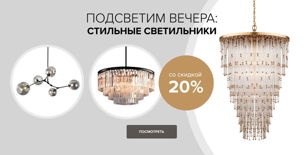 Чем больше у вас дома сценариев освещения, тем лучше. В нашей подборке много объемных люстр и лаконичных потолочных светильников. А еще — стильные настольные лампы и классный светильник-прожектор. Листайте нашу подборку, чтобы увидеть все модели. Кстати, весь сентябрь на них будет действовать скидка 20%.