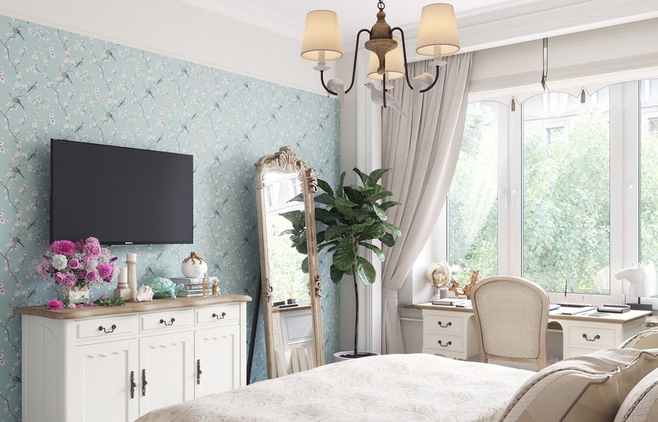 Дизайнер Юлия Чернова в проекте двушки рядом с МГУ выбрала светлую гамму в пастельных тонах, поэтому интерьер получился легким. Мебель для спальни подобрали в молочных оттенках: кровать с изящным тканевым изголовьем и белый гарнитур в классическом стиле с минимальным декором. Картину завершило винтажное напольное зеркало и зеленые растения в кашпо.
